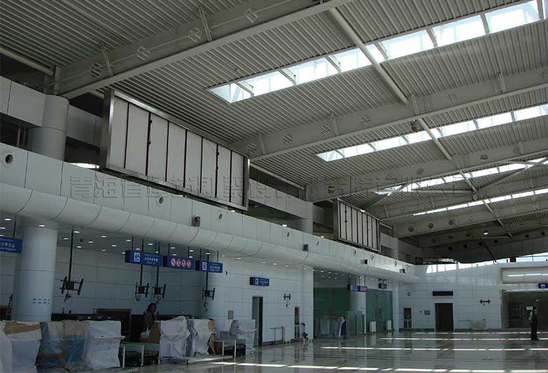 7.本工程采用散熱器和球形噴口送熱風(fēng)的采暖形式。通風(fēng)在侯機(jī)室和主要房間內(nèi)設(shè)新風(fēng)換氣機(jī)組,充分考慮了熱量回收,減少能耗,使航站樓成為節(jié)能建筑。